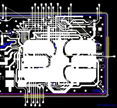 2、基板的制作工藝特殊,每條線都必須是由電鍍線采用電鍍的手法將銅材質(zhì)澆筑以至形成焊盤和走線,或者其它一切的需要用到銅的地方。這里必須注意到,就算是沒有電氣連接即沒有網(wǎng)絡(luò)的焊盤,都必須在eco模式下,將焊盤拉出板框外來將該焊盤鍍銅,否則將出現(xiàn)該焊盤無銅的結(jié)果。且拉出板框的電鍍線必須有一個(gè)在其它層的銅皮標(biāo)識(shí)出其腐蝕的位置,這里用七層的銅皮標(biāo)識(shí)。一般而言,該銅皮超越板框靠里0.15mm,而鋪銅的邊緣距離板框約為0.2mm距離。