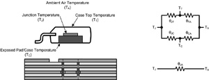 現在來快速了解一下如何進行不含散熱片的簡單PCB散熱設計,圖3示意了模塊及作為熱阻抗的PCB。與從結到裸片焊盤的熱阻抗相比,由于結與外封裝頂部間的熱阻抗相對較高,因此在一次估計從結到周圍空氣的熱阻(θJT)時,我們可以忽略θJA散熱路徑。