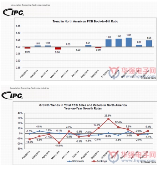 PCB總訂單量,與2014年2月份相比,同比增長5.1%,推動年初至今的訂單量增長0.9%;與上個月相比,環(huán)比下降了0.7%。2015年2月份北美地區(qū)PCB行業(yè)訂單出貨比,高達1.05。