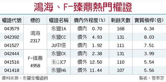 蘋果新機上市加持等利多浮現(xiàn),永豐金證衍商部指出,鴻家軍中的鴻海(2317)及F-臻鼎(4958)熱門認(rèn)購權(quán)證很夯。