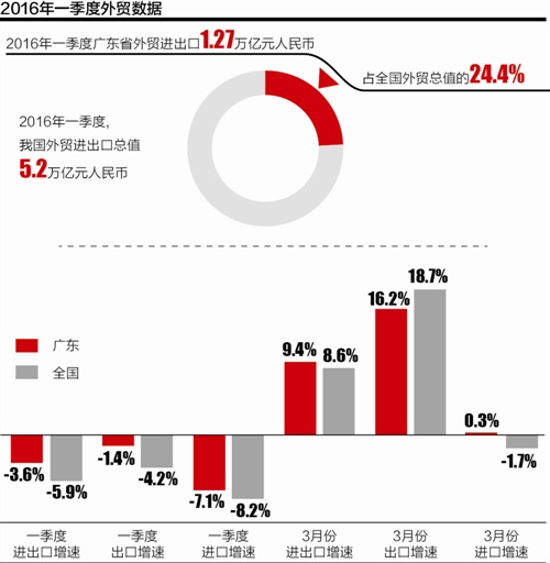 據海關總署數據,今年3月份我外貿總值增長8.6%,其中出口大幅增長達18.7%,實現9個月來首次轉正。作為外貿大省,廣東省3月份進出口也表現搶眼,同比均實現正增長。數據顯示,廣東省一季度外貿總值降幅為-3.6%,明顯強于同期全-5.9%的表現。