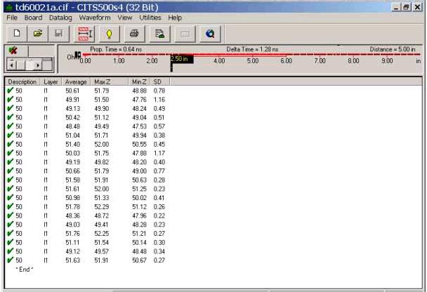 以下是采用TDR測試系統(tǒng)測試該板的阻抗測試結(jié)果,從結(jié)果可看出該板所測試的阻抗都在47.5∽52.5Ω之間,即完全滿足客戶50±5%Ω(50±2.5Ω)的阻抗要求. 因此,可看出對于客戶±8%甚至±5%的阻抗控制精度要求只要在生產(chǎn)前采用計(jì)算精度比較高的軟件進(jìn)行較為準(zhǔn)確的模擬預(yù)測,結(jié)合模擬預(yù)測的結(jié)果對相應(yīng)的一些參數(shù)做適當(dāng)調(diào)整,在生產(chǎn)過程中對重點(diǎn)工序加以特別的控制,同時(shí),測量時(shí)確保測量的正確性,還是可以達(dá)到的。