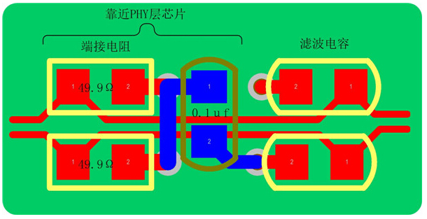 c) 網口變壓器PHY層芯片側中心抽頭對地的濾波電容要盡量靠近變壓器管腳,保證引線短,分布電感小;
